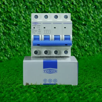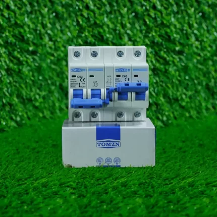 Tomzn 3-phase 4-pole MCB for 230/400V AC systems. Rated at 63A, it offers full protection for line and neutral. Ideal for factories, commercial DBs, and heavy electrical loads.