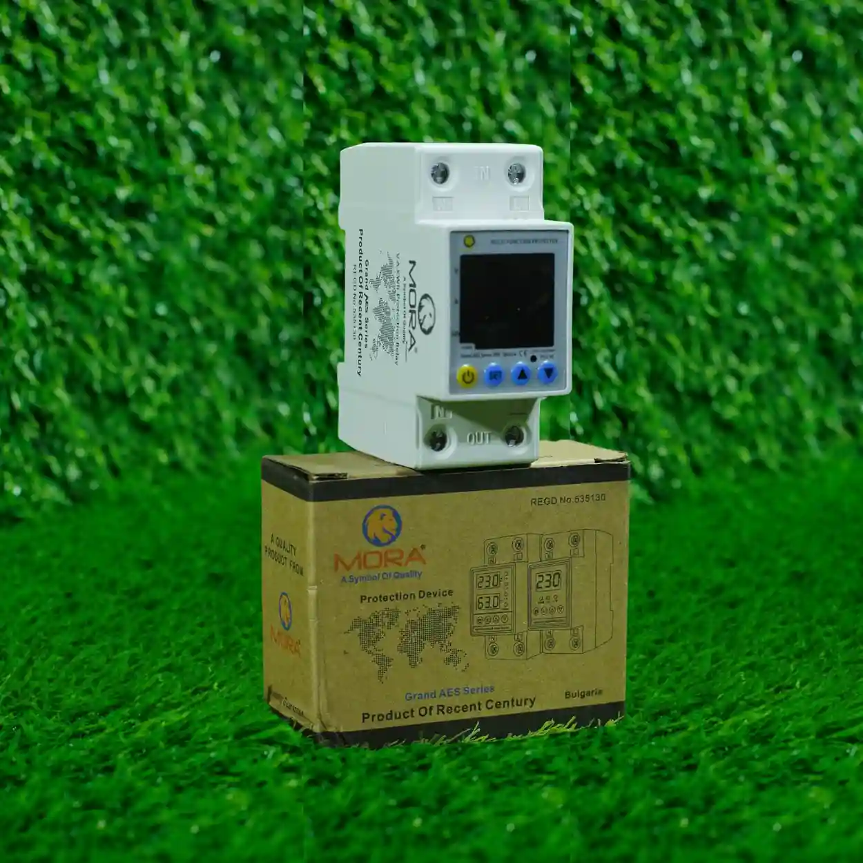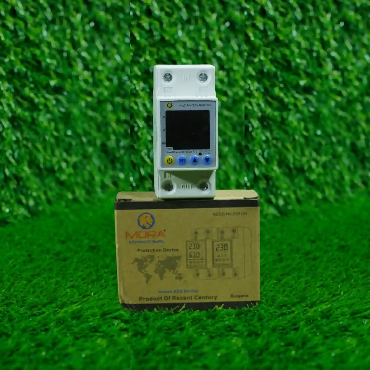 3-in-1 voltage protection device by Mora. Automatically cuts power during over/under voltage and monitors power usage with built-in kWh energy meter. Ideal for home and office use.
